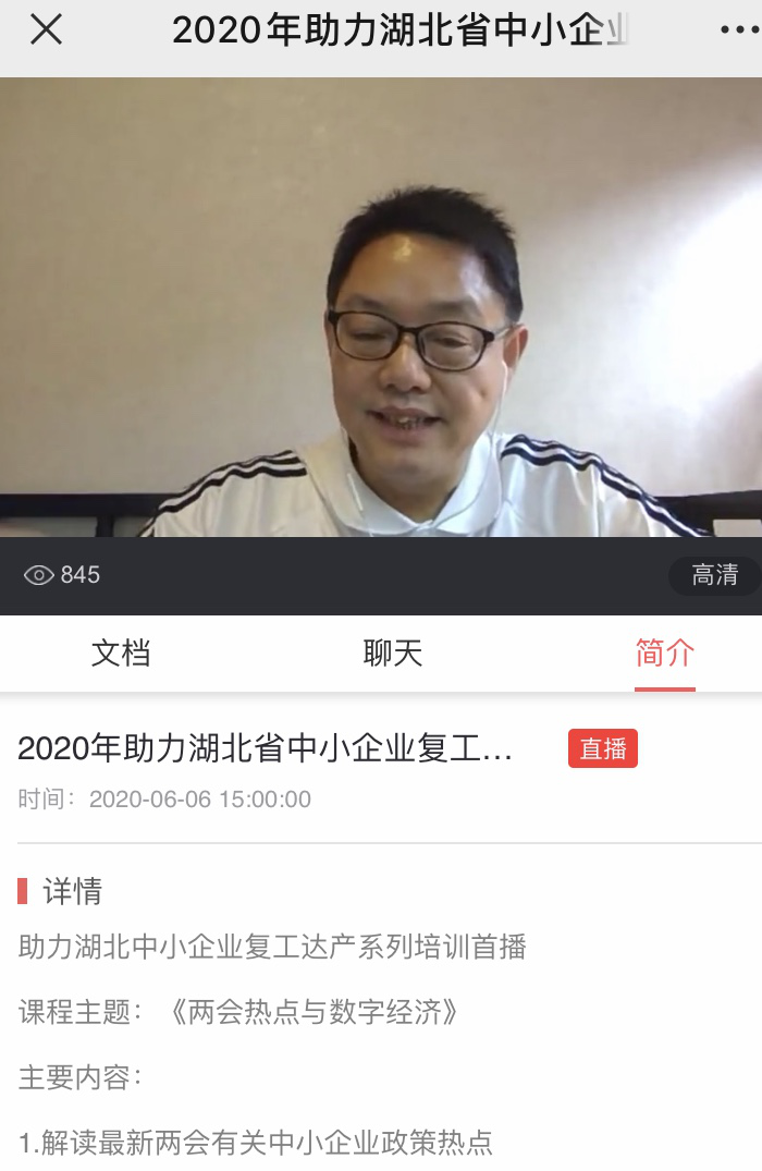 培训由中南财经政法大学财税学院教授、博士生导师,湖北省统计局副局长叶青同志以《两会热点、数字经济、十四五规划》为主题,从最新两会有关中小企业政策热点、疫情下中小企业在数字经济中得发展机遇、湖北十四五规划三圈三带中蕴含的中小企业发展机会等方面为企业答疑解惑。课程内容丰富,信息资讯新鲜,案例翔实充分,政策解读准确。授课过程中互动热烈,参会学员踊跃提问,短短三十分钟的互动环节,学员提出了十五个问题,主讲老师热情细致地回答了学员的问题。