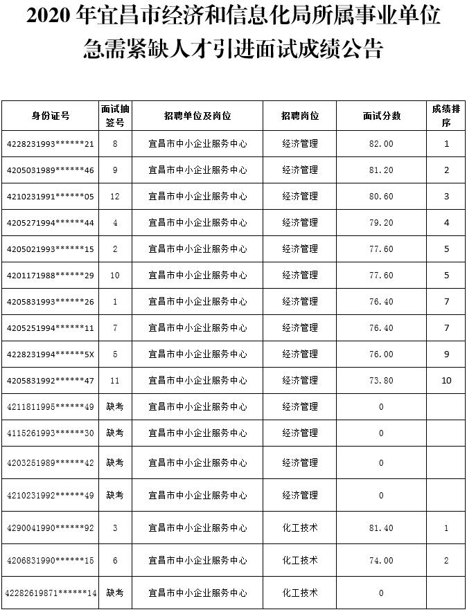 附件:1.2020年宜昌市经济和信息化局所属事业单位急需紧缺人才引进面试成绩公告